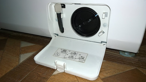 Put rags around the container and you can begin the process of cleaning the waste filter of the lg washing machine. Make sure the unit is empty, turned off, and drained of any visible water in the tub. The hose is attached to the washing machine at the top, on the right side.
